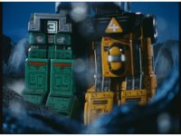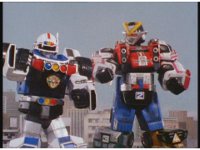 Robo Racer stays behind posing battle ready, while Rescue Megazord slowly staggers away. |