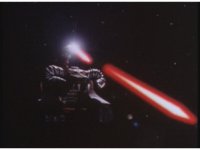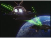 Astro Megaship's front section splits open, emitting green tractor beam forth at the approaching NASADA Shuttle. |