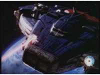 The Sphinx Ship fires upon the hull of the Astro Megaship multiple times. |