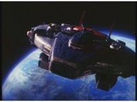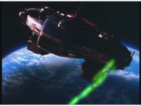 Five Ranger-colored energy streaks shoot out of the Astro Megaship. |