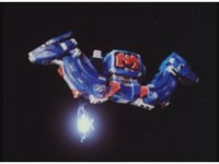 Holding its shield forth, the Astro Megazord rips through the burning atmosphere on reentry. |
