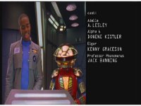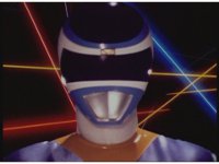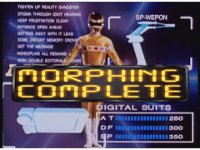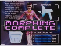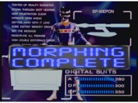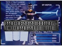 Blue Space Ranger spins around, text & displays appear, including "MORPHING COMPLETE". |