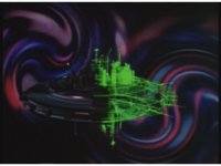 The Shuttle soars through space, spinning around, before approaching the Megaship, which is in the process of transforming. |
