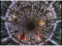 The five Rangers ride their Galaxy Gliders through the Cyber Tunnel. |