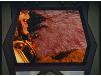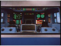 Side angle on the three guys in the cockpit, Red rotates his head widely about while talking. |