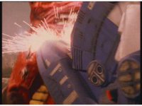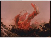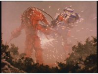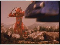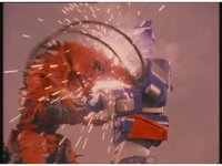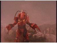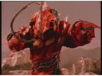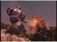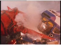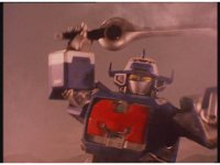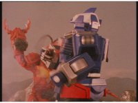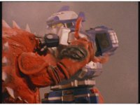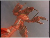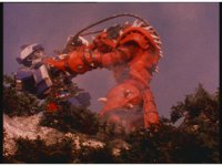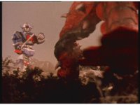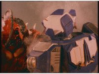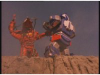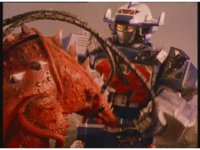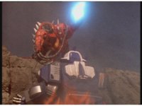 Still gripping his antennae, Astro Megazord sparkily headbutts Clawhammer repeatedly, before lifting the monster off the ground by the antennae, smashing him into the ground, swinging him around, until his antennae snap off sparkily, causing both to fall over. |