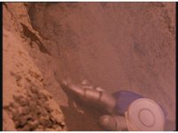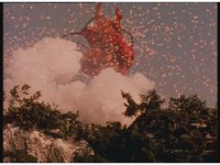 As Elgar watches, pan down, in actual archival footage of a volcanic lava river flowing. |