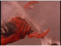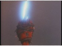 Continued from three shots ago, the energy swirl is caught by the tip of the Astro Megazord Saber, which allows it to whip it back at Clawhammer, explosively. |