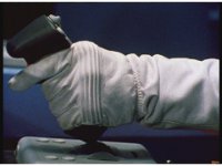 A gloved hand grabs the joystick control, causing the Astro Megazord to punch block Clawhammer's claw. |
