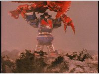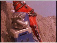 Red grips both joysticks, causing the Astro Megazord to leap up and out of the volcano, landing before Clawhammer and posing battle ready. |