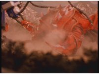 Clawhammer guides the Astro Megazord over beside the edge of the volcano's flaming mouth, sparkily pinching its neck with his claw. |