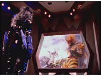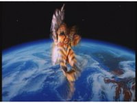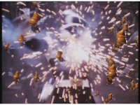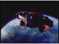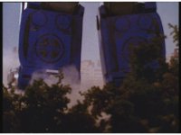 The Shuttle does one final loop before approaching the Megaship, which is in the process of transforming, followed by the Shuttle transforming into the head. |