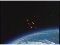 Five Ranger-colored energy streaks depart the Earth's atmosphere. |