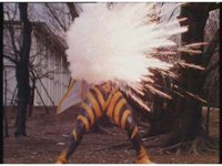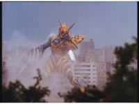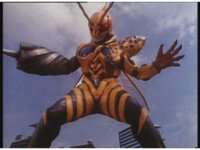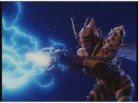 Sting King fires eyebeams at Astro Megazord, which blocks them with its shield, before returning fire with its Blaster, explosively striking the monster. |
