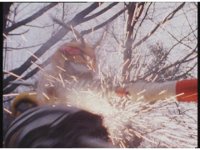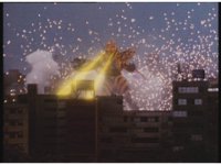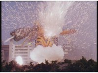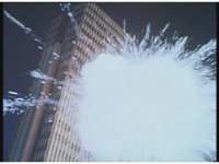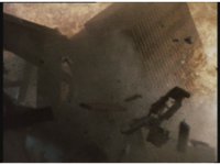 As a severed office building erupts into a series of explosions upon an overpass, the burned-out shell of an automobile is visibly flung about in the debris. |