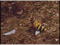 Black falls over amid the swarm of bee drones, then pulls out his Astro Blaster and fires upon Sting King, blowing up his right arm, killing all of the bee drones. |