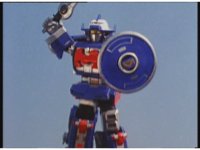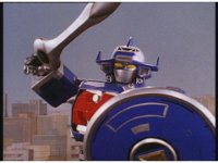 Astro Megazord, with Shield in hand, flies down from the sky. |