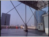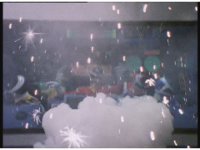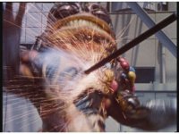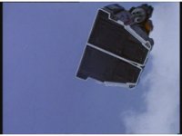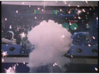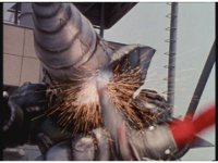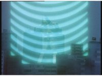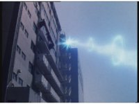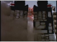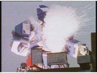 Close on upper roof area of building, as the antenna at the top spark bursts, quickly causing the rooftop structure below it to explode into debris. |