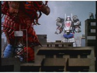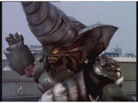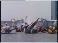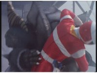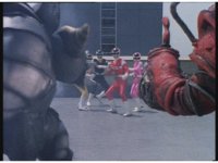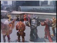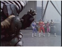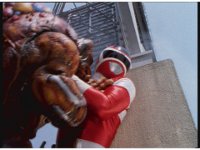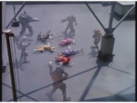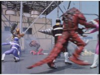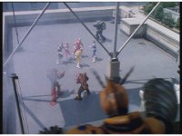 The Rangers are getting beaten up by the monsters on the roof, Red trying to talk into his Battlizer, but the Delta Megazord fails to respond. |