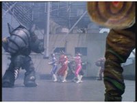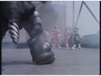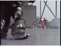 The Rangers pose with their Weapons as the five monsters suddenly rise back to their feet, Red then Blue reacting nervously, Powerdriller slowly approaching. |