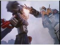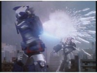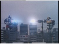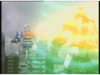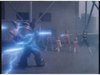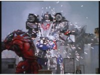 Delta Megazord fires sparkily at Astro Megazord repeatedly. |