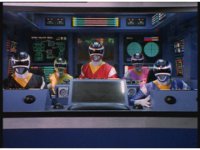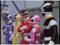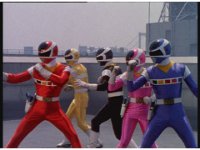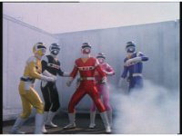 All of the Rangers reach forth with their right hands, palm out, then grab their controls. |