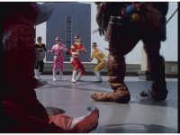 The five monsters slowly approach the Rangers, Red talking into his left wrist anxiously. |