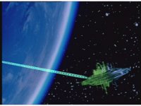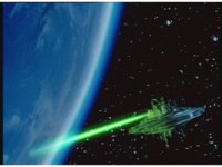 Dark Fortress fires the Evilyzer beam toward Earth. |
