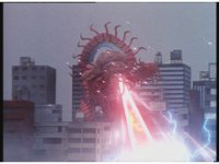 Destructipede fidgets about, then fires a blue energy beam from his forehead out into the city. |