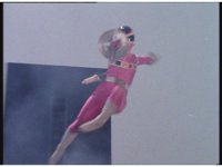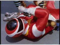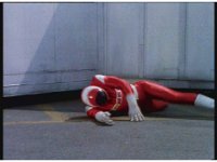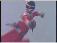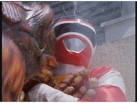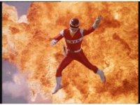 Red Ranger is thrown into the air in front of a fireball bursting behind him, knocking him into a wall. |