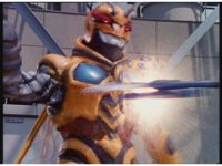 Astro Megazord motions arms and fires a golden beam from its chest, striking the Delta Megazord as it stands under the Evilyzer's beam, causing it to become conflicted. |