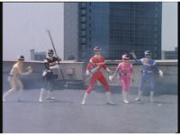 The Rangers run onto the scene, then teleport over onto a rooftop, where they look around for a moment, before a brief quake makes them defensive. |