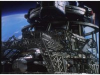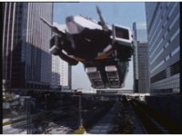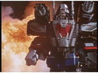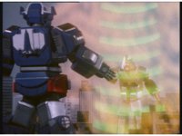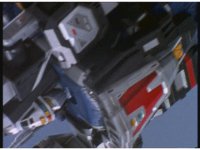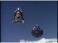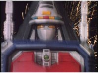 The Shuttle does one final loop before approaching the Megaship, which is in the process of transforming, followed by the Shuttle transforming into the head. |