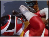 Delta Megazord appears in agony over the pair of beams striking it at once, sharp zoom in on Red holding on tight in the cockpit. |