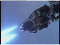 Looking up, Red pulls back on the control sticks, causing Astro Megazord to follow Delta Megazord into the sky, where both quickly switch back into Megaship forms. |