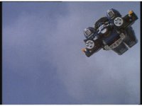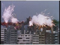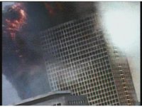 As a severed office building erupts into a series of explosions upon an overpass, the burned-out shell of an automobile is visibly flung about in the debris. |