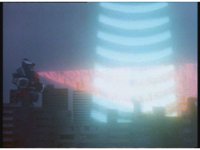Astro Megazord stands still in the city, facing our right, glowing. |