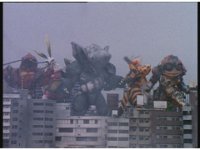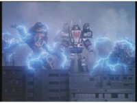 The five monsters erupt in spark burstings, the Rangers cheer, the monsters reappear unharmed, the Rangers react. |
