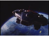As Astro Megaship slowly drifts forth above a planet, a red then a yellow streak shoots out from it. |