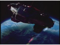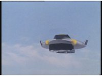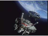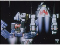 The Shuttle does one final loop before approaching the Megaship, which is in the process of transforming, followed by the Shuttle transforming into the head. |