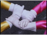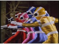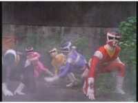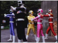 Black & Blue hold their hands like so, Yellow & Pink interlocking their hands, Red gestures, then leaps up, bounces off the girls' hands, flips over, and launches off of the guys' hands, flinging forth with added momentum at the monster. |