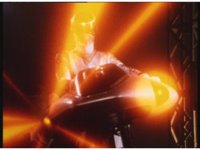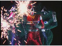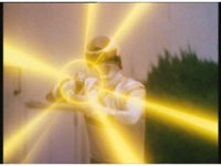 Silver falls, rolls, gets up and fires his Super Silverizer at Ecliptor, who blocks the lasers, then fires eyebeams back, spark bursting Silver down. |