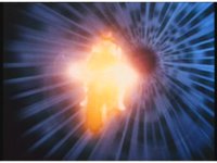 Five Ranger-colored energy streaks shoot out of the Astro Megaship. |