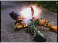 The flying fists rip through blue Crocotox explosively. He then falls and explodes massively behind the Astro Delta Megazord. |