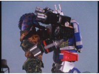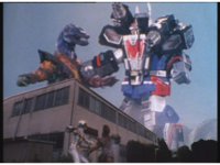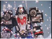 The Delta Megazord chest piece finishes locking onto Astro Megazord's body. |