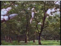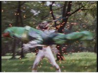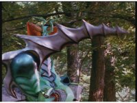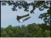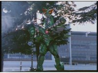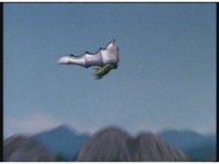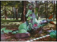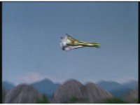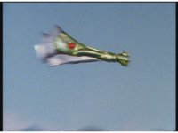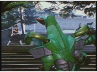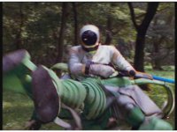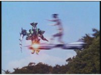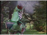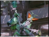 Preying Mantis readies his scythe, then leaps up and drops down toward the downed Rangers, when Silver Ranger on his Silver Glider swoops in and strikes the monster in midair, knocking him away. |