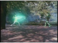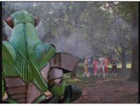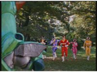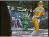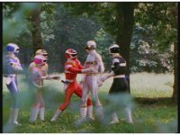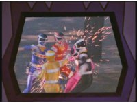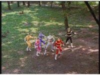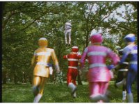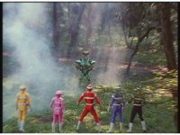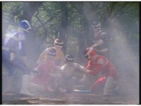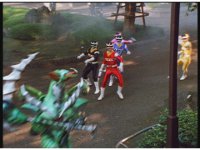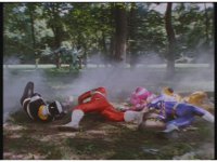 All five Rangers charge in at Preying Mantis at once, he floats up and they end up sparkily striking each other instead, as the monster leaps to safety. |