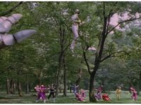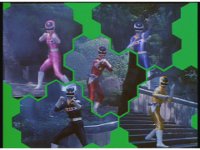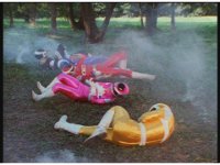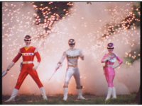 Red, Silver, & Pink turn around slowly and pose as Preying Mantis falls and explodes. |