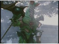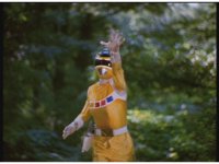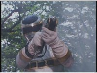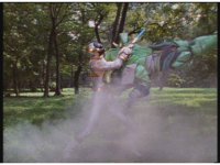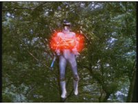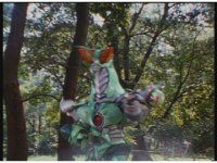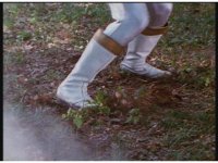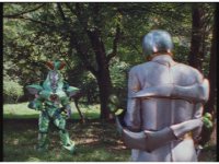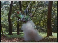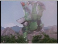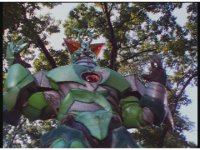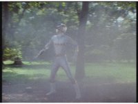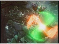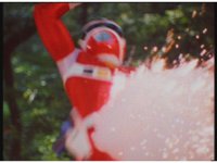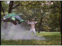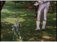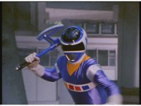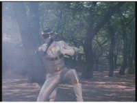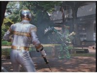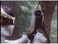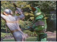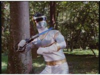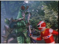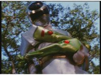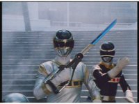 Silver readies his Super Silverizer in saber mode, runs at the monster, who slashes the ground, sending dust bursting up, covering his retreat from the scene, leaving the Ranger at loss. |