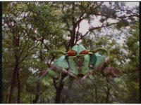 Red & Blue do flying punches at Preying Mantis, who merely jumps up out of their way. |